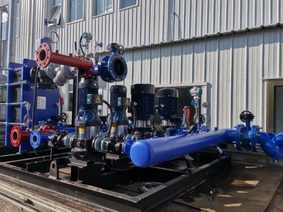 换热机组是由换热器、温控阀组、疏水阀组(热媒为蒸汽时)循环泵、电控柜、底座、管路、阀门、仪表等组成,并可加装膨胀罐、水处理设备、水泵变频控制、温控阀、远程通讯控制等,从而构成一个完整的热交换站。换热机组具有标准化、模块化的设计,配置齐全,安装方便、高效节能。换热机组结构紧凑、运行可靠、操作简便直观等优点,是首选的高效节能产品。该产品适应于住宅、机关、厂矿、医院、宾馆、学校等场合的卫生热水。整体式换热机组既可用于水—水交换,也可用于汽—水交换。